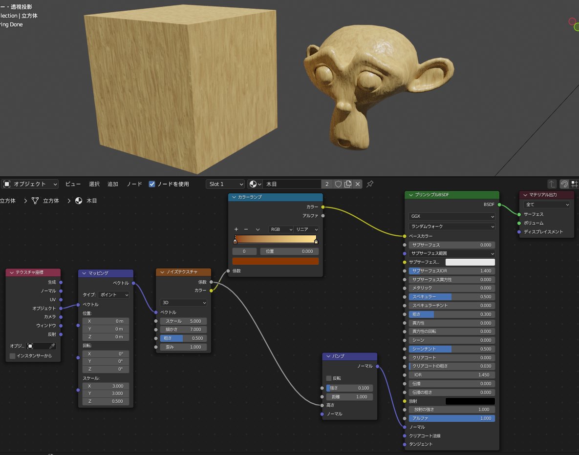 Blenderで画像を使わずプロシージャルに、木目調のマテリアルを表現するノードの組み方のメモです。
